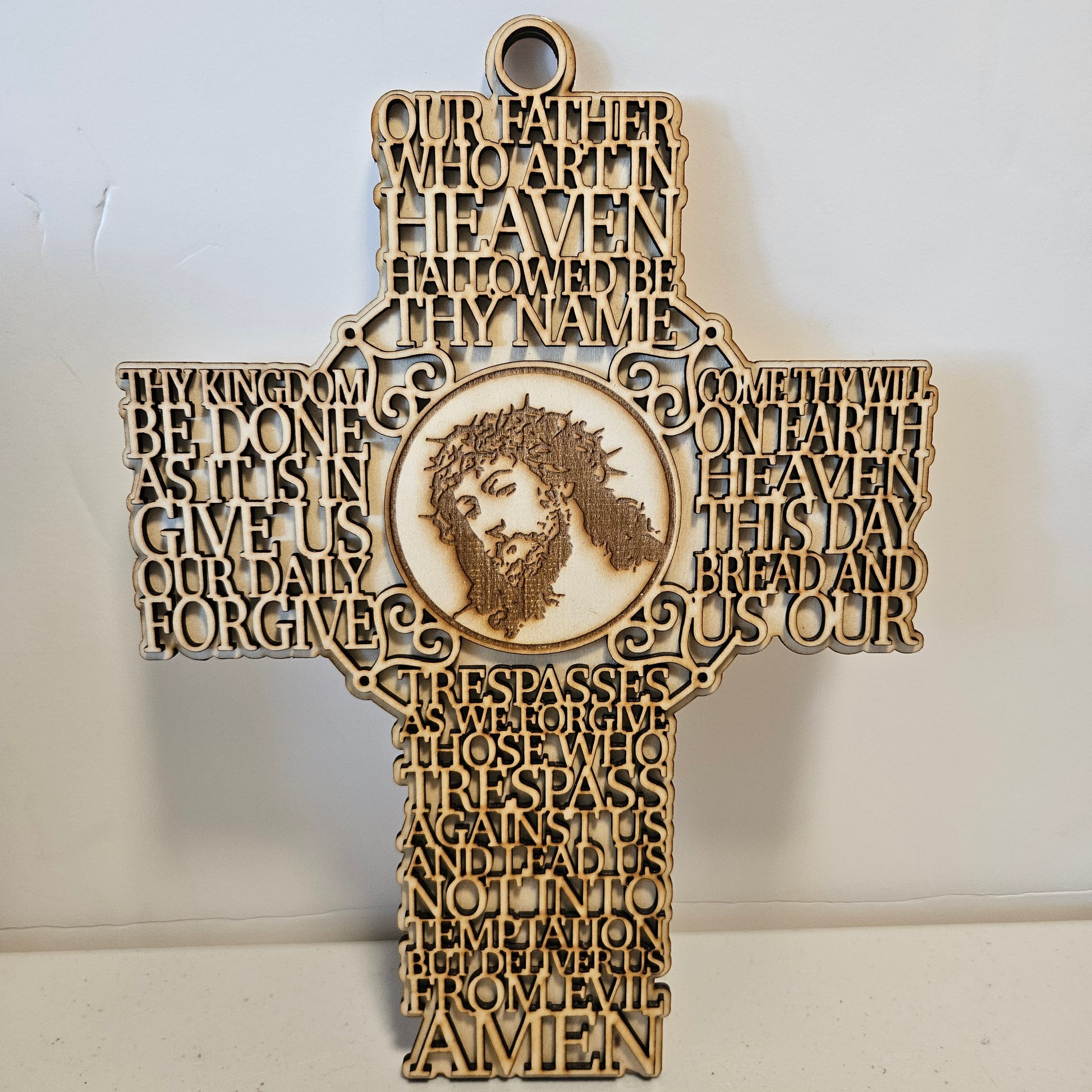 This beautiful wooden cross features two layers of Baltic birch and is engraved with the powerful words of the Lord's Prayer with an etch of Jesus in the center. Perfect for gifting to a loved one or for bringing peace into your own home and life.
