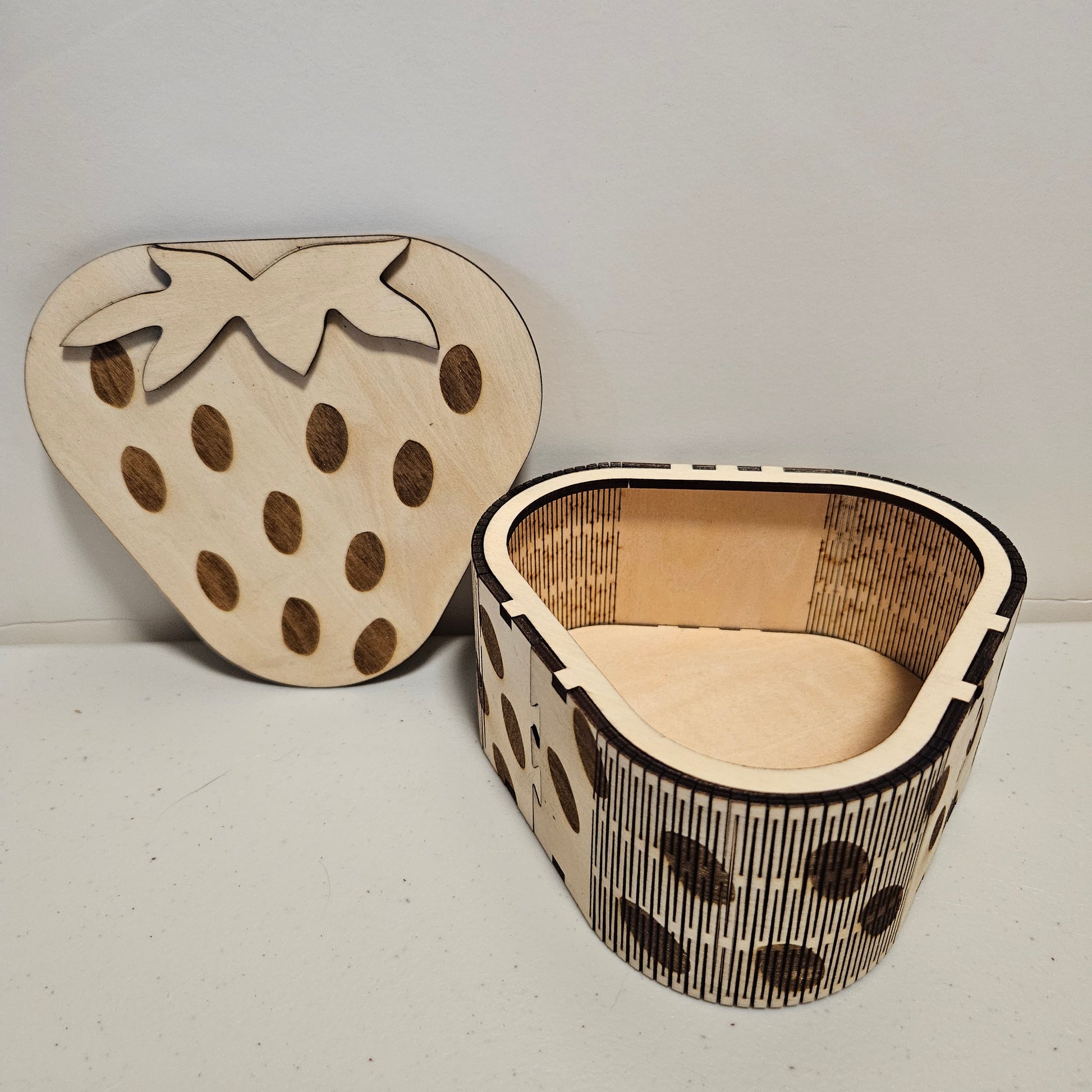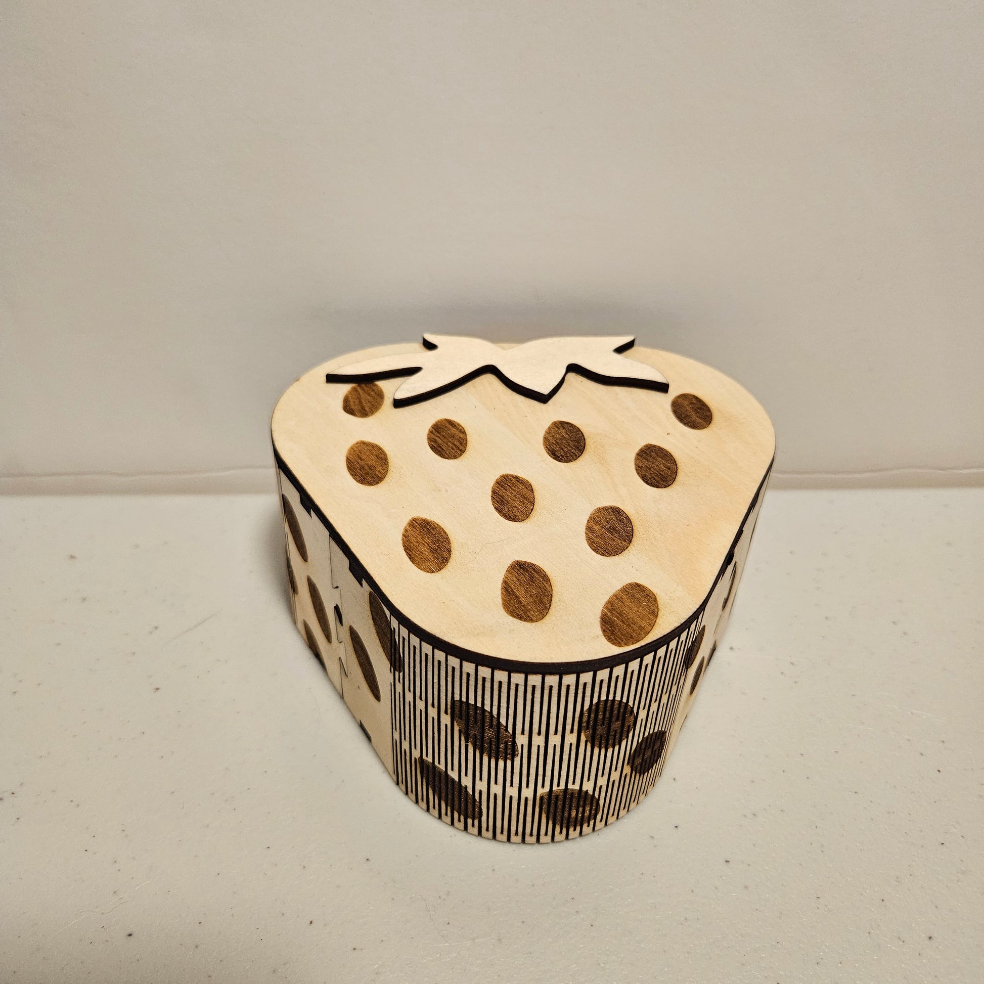 Add a touch of whimsy to your storage solutions with our Baltic birch Strawberry Shaped Box. Perfect for housing small treasures or organizing trinkets, this playful and unique box is shaped like a juicy strawberry. It's a fun addition to any home decor!